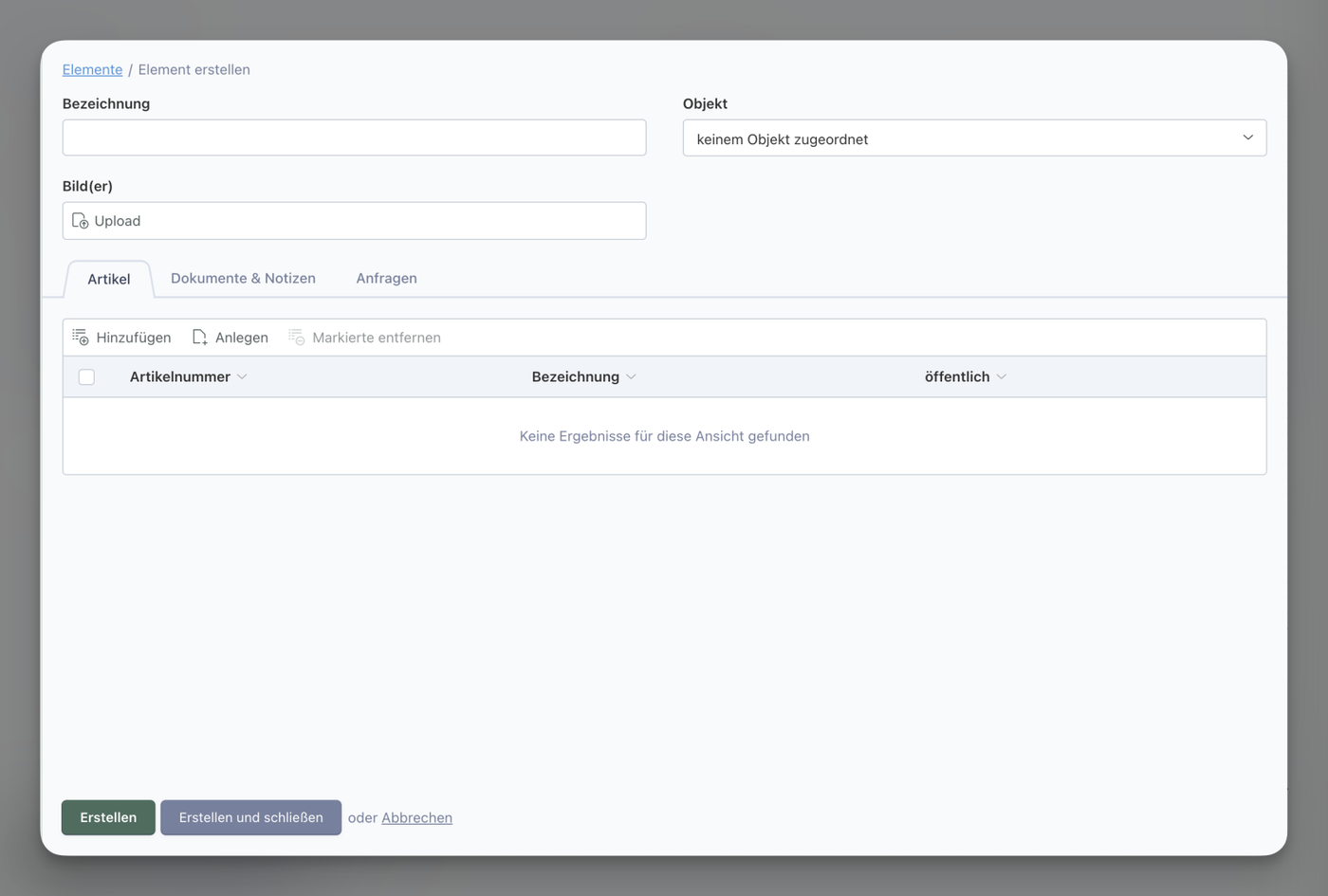 - Bilder: Falls Sie bereits ein Bild vom Element haben, können Sie es hier hochladen. Klicken Sie auf „Upload“, um ein Bild hinzuzufügen. Ist das Element vor Ort, kann über die Elemente-Webseite ein Bild des Elements hochgeladen werden.