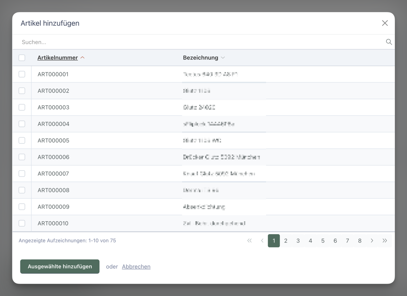 - In diesem Modul können Sie durch die Volltextsuche gezielt nach Artikeln suchen. Sobald Sie die gewünschten Artikel ausgewählt haben, klicken Sie auf „Ausgewählte hinzufügen“ und die Artikel werden dem Element hinzugefügt
