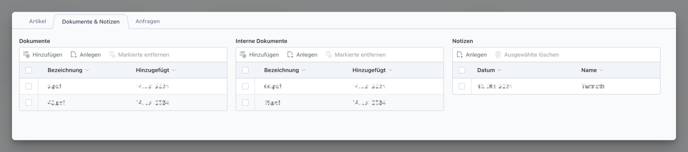 - Notizen hinzufügen: Sie können Notizen direkt in diesem Bereich anlegen. Notizen sind immer intern und nur nach Anmeldung sichtbar. Nutzen Sie die Option „Ausgewählte löschen“, um einzelne Notizen zu entfernen.