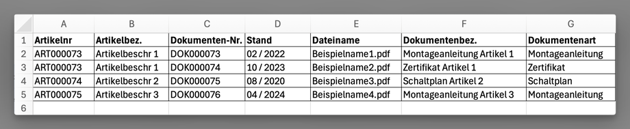 • Wenn ein Artikel mehrere Dokumente hat, wiederholen Sie die Artikelnummer in der CSV-Datei für jedes Dokument. Jedes Dokument benötigt eine separate Zeile, um Details wie Dateiname, Dokumentenbezeichnung und Dokumentenart anzugeben.